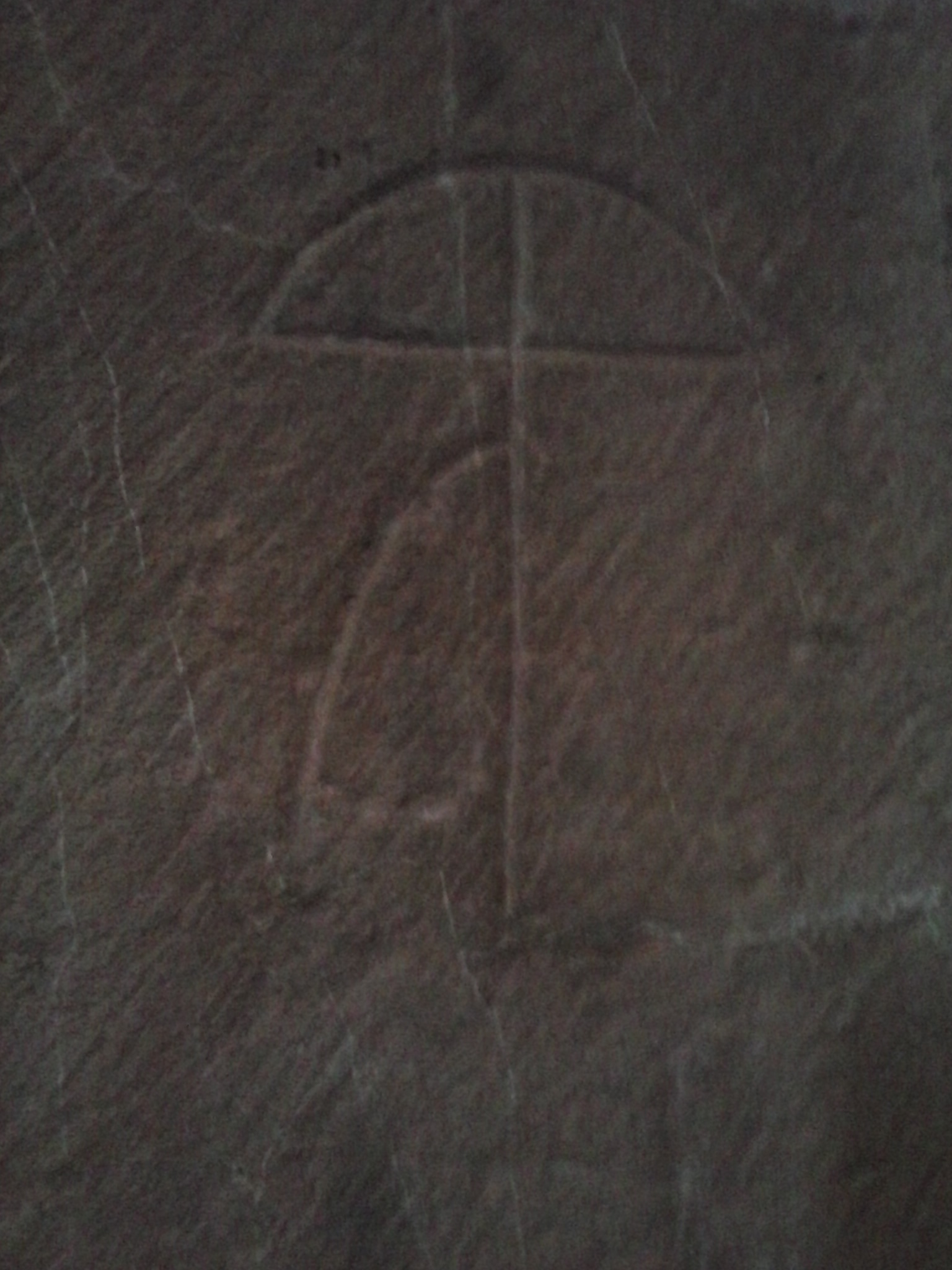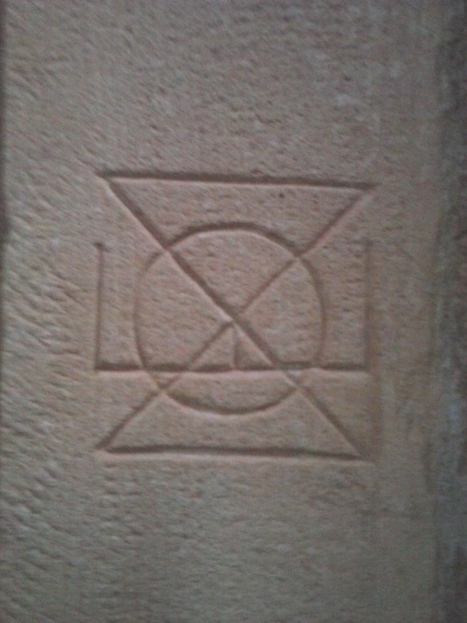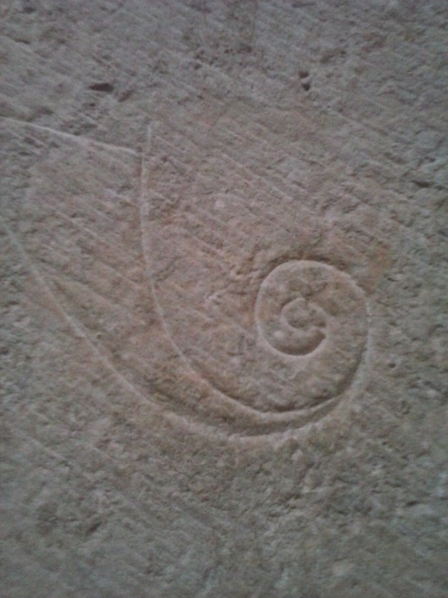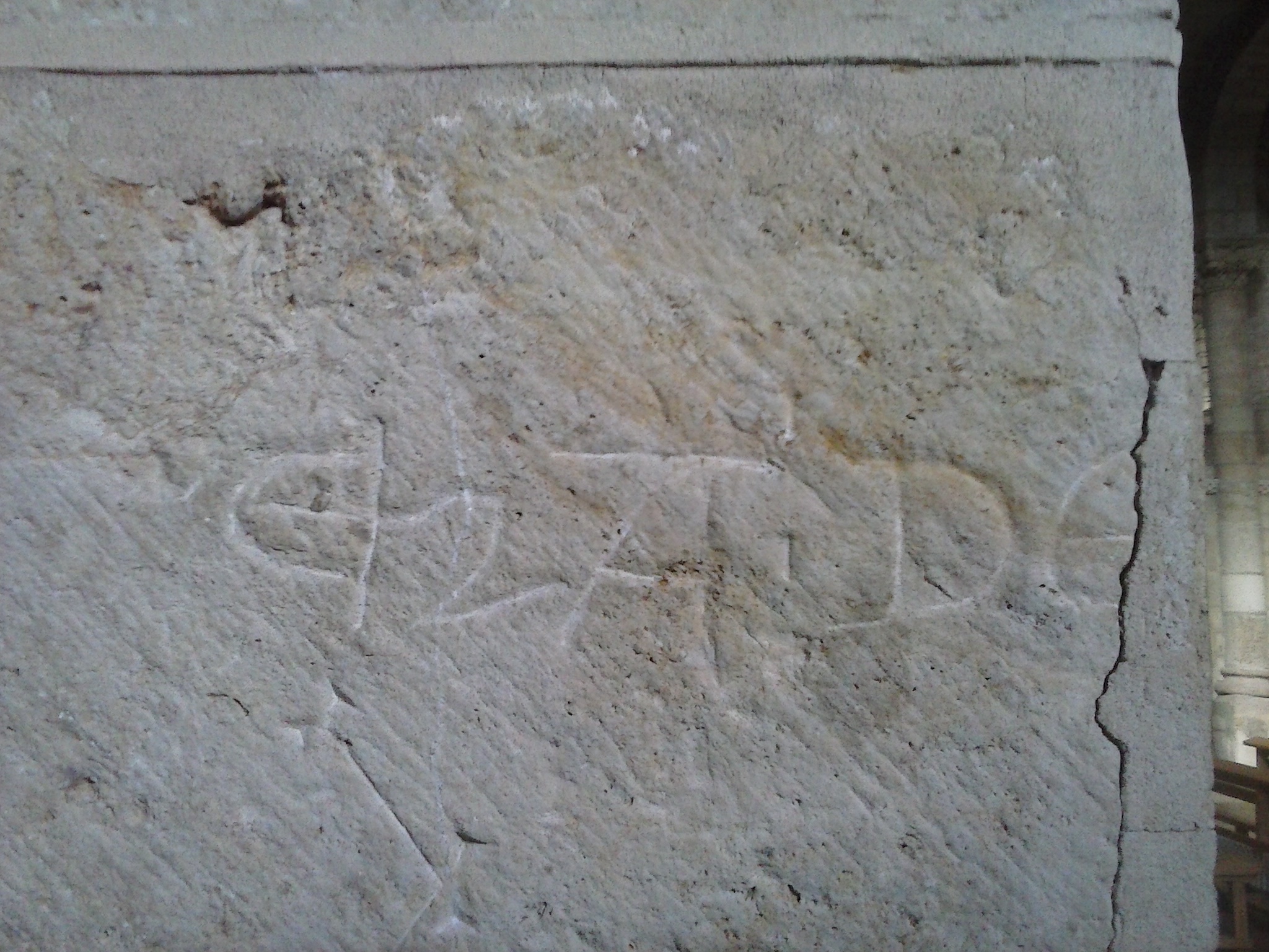 Aparte de la alegría de estos halagos, me llevo otras. Por ejemplo, el placer enorme de pasear por tres bellas ciudades, una de las cuales visité por vez primera: León. Hoy estuve intentando perderme en la zona vieja de la ciudad y entré en la basílica románica de San Isidoro. Acababa de terminar la misa, había corrillos en la puerta. Algunas señoras mayores se habían quedado en la iglesia y rezaban el rosario de rodillas en los reclinatorios. Me fijé que en algunas piedras de las paredes había marcas con forma de flecha y pensé que habían servido a los constructores para señalar posiciones de colocación. Seguí mirando con atención y descubrí una letra, la b. Buscar estas marcas se convirtió en un juego. Fui mirando a la altura de mis ojos y encontré una en forma de ballesta, más letras, y terminé por fotografiar algunas de ellas.