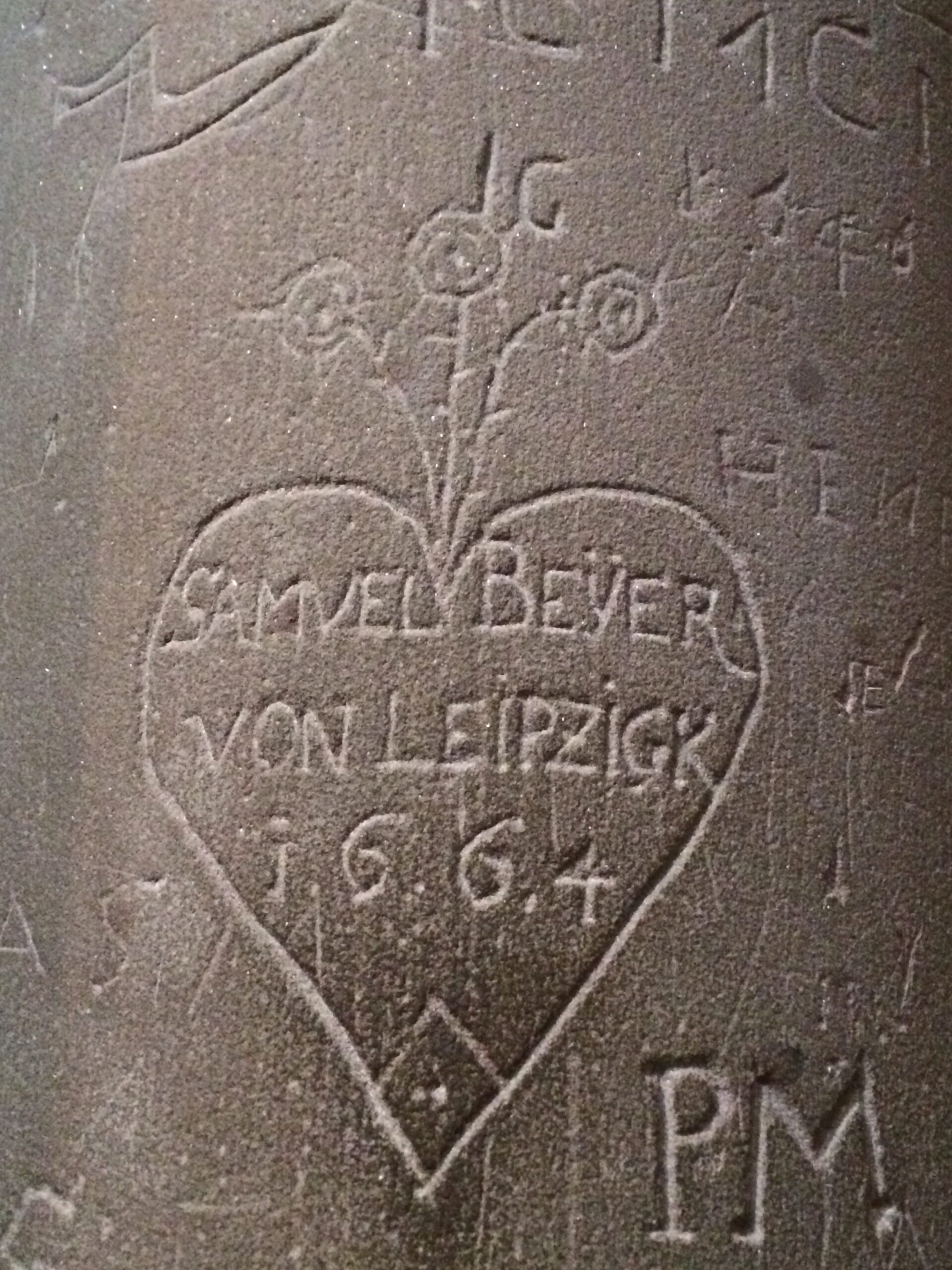 Hay cosas pequeñas que me maravillan, como estas marcas en la columna gótica de la catedral, al lado del imponente reloj astronómico. También me fascinó la exposición de Käthe Kollwitz en el Museo de Arte Moderno y Contemporáneo. Y una librería a la que Paula nos llevó varias veces. O el otoño a orillas del río y el continente desde la ventanilla del avión. Volveré a ver los graffitis en piedra. Cada año el festival decide que un narrador o una narradora repitan y me han invitado a regresar. Así que estoy feliz porque seguiré moviéndome, yendo de un lado a otro. Ya tengo apuntada una cita para octubre del 2020 en Estrasburgo.